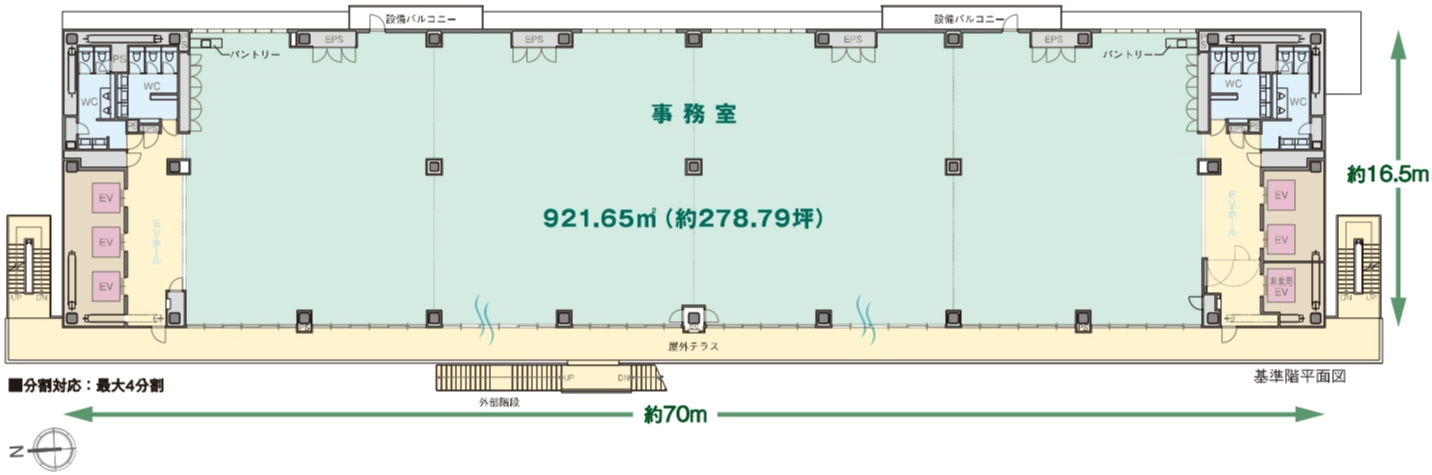 南北に広がるワイドな間口を活かした設計で、EVコアを2箇所に設置。2分割までは共用廊下不要な効率的な空間構成となっています。