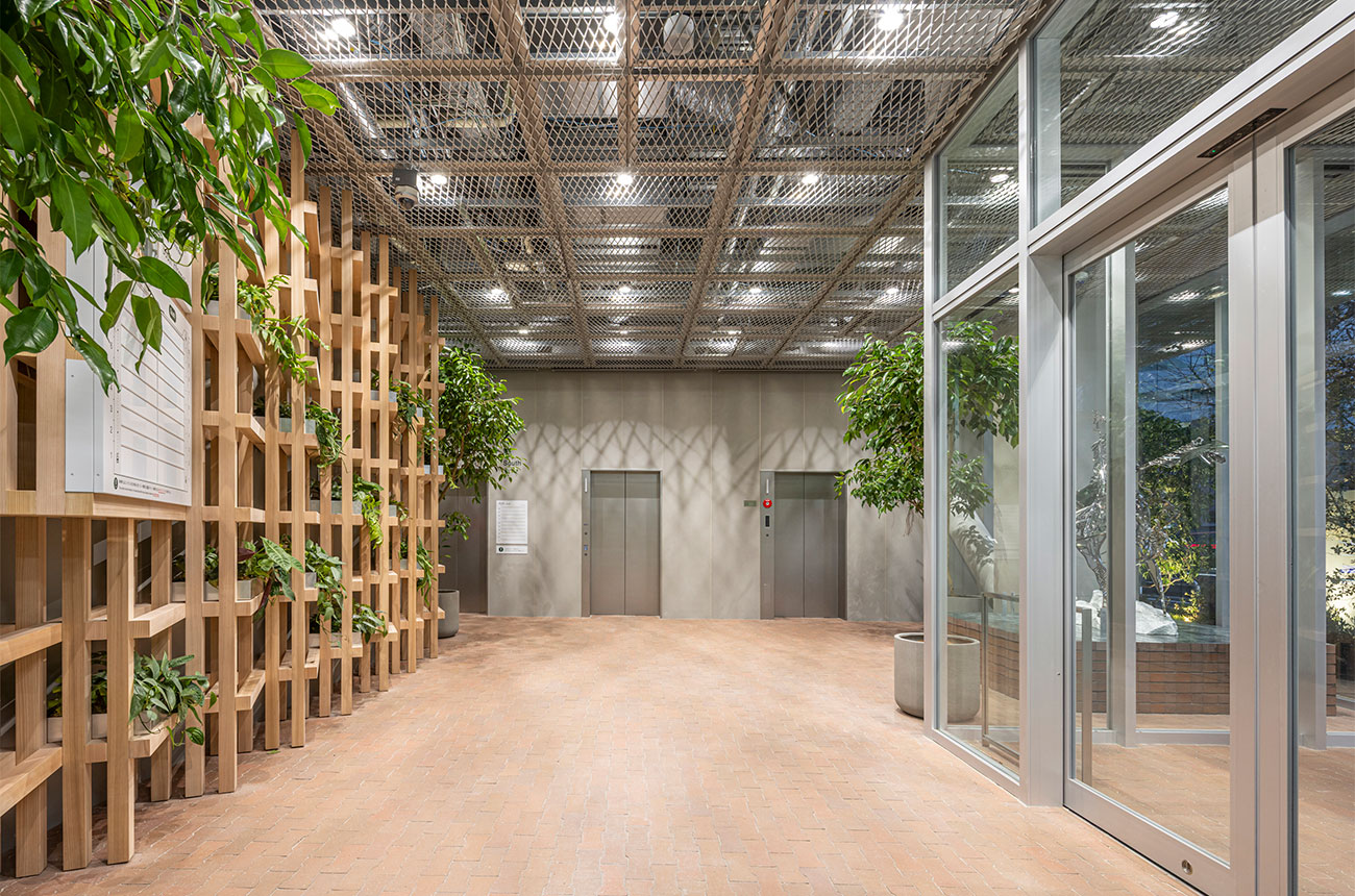 豊かな緑と木の素材感に包まれる1階エントランス空間。国道15号に面して店舗区画も配置し、カフェ(THE CITY BAKERY)、多目的イベントスペース(グレイドパーク品川)が出店します。