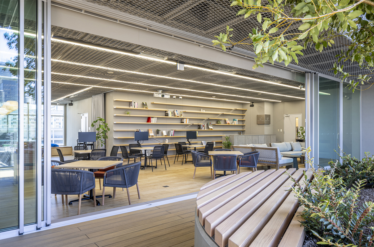 東西双方の大開口により風と光を感じるウェルネスなオフィス環境を形成すると共に、西側からはテラスに出入りできる開放的な空間設計を実現しています。