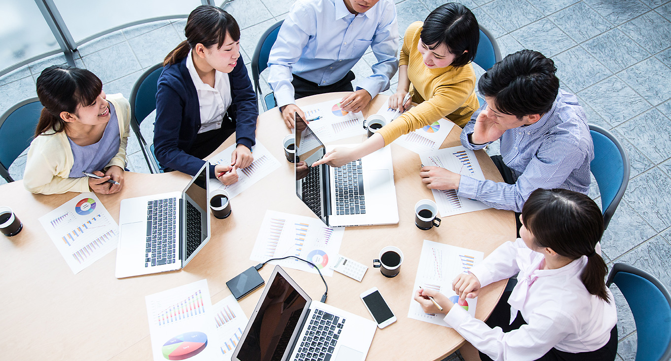 業務内容や気分に合わせて作業スペースを自分で選択できる、自由度の高いレイアウト。グループワーク・ソロワーク・ラウンジなど多様なワークスペースを用意しています。