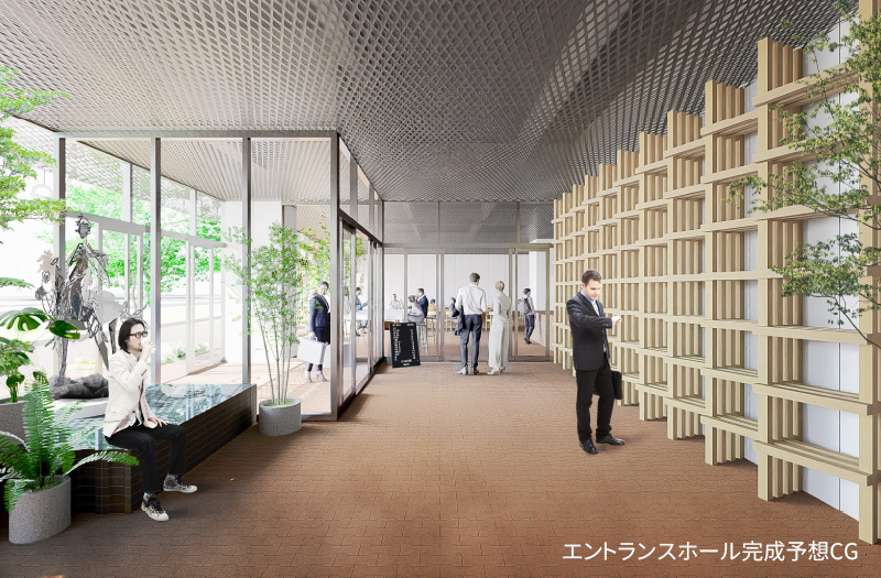豊かな緑と木の素材感に包まれる1階エントランス空間。国道15号に面して店舗区画も配置し、ワーカーをサポートするカフェや店舗等の出店も計画されています。